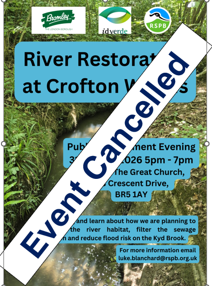 The London Borough of Bromley public engagement evening to discuss proposed habitat creation works on the West Kyd Brook in Crofton Woods planned for 31 March 2026 5pm - 7pm at St James The Great Church, 283 Crescent Drive, BR5 1AY. is cancelled